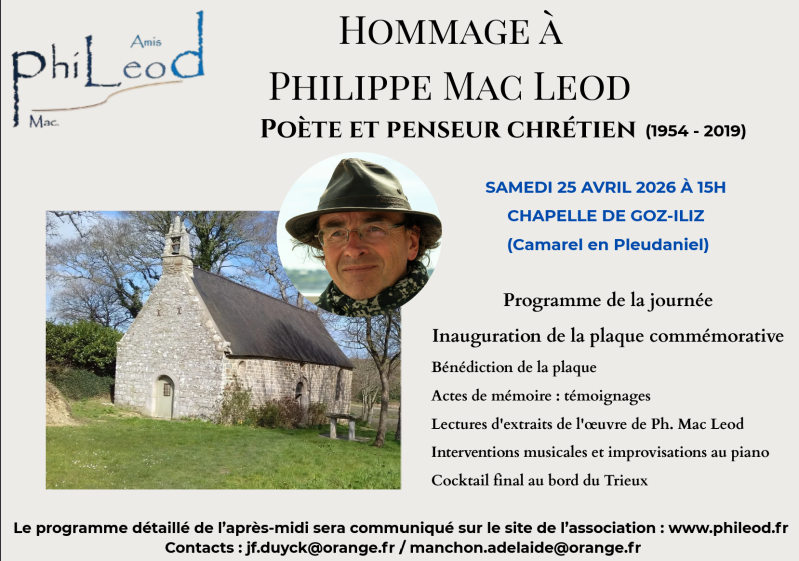 L’association des amis de Philippe Mac Leod, créée en mars 2023, se donne pour ambition d’élargir la connaissance et la diffusion de son héritage littéraire et spirituel. Composée d’adhérents qui s’engagent à maintenir vivante, et agissante, la force de son œuvre, l’association a organisé ses premières conférences sur deux journées, les samedis 18 novembre 2023 et 16 mars 2024 à la Maison d’accueil l’île Blanche - 29241 Locquirec.